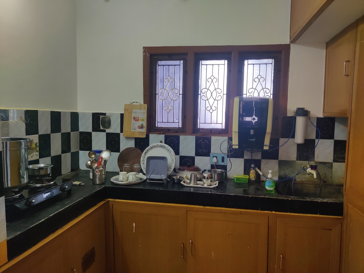 Welcome to Vasantha’s Home Stay -- a clean, peaceful and secure place for families and groups. Enjoy a spacious living room with Smart TV, large AC bedroom with 2 queen-size beds, dressing area and safe storage. Cook with ease in the fully equipped kitchen with a stove, fridge and utensils, while a washing machine is available for laundry. Includes an attached hot-water bathroom plus a common wash area. Secured with CCTV and a remote-operated gate, offering a safe home-away-from-home experience.