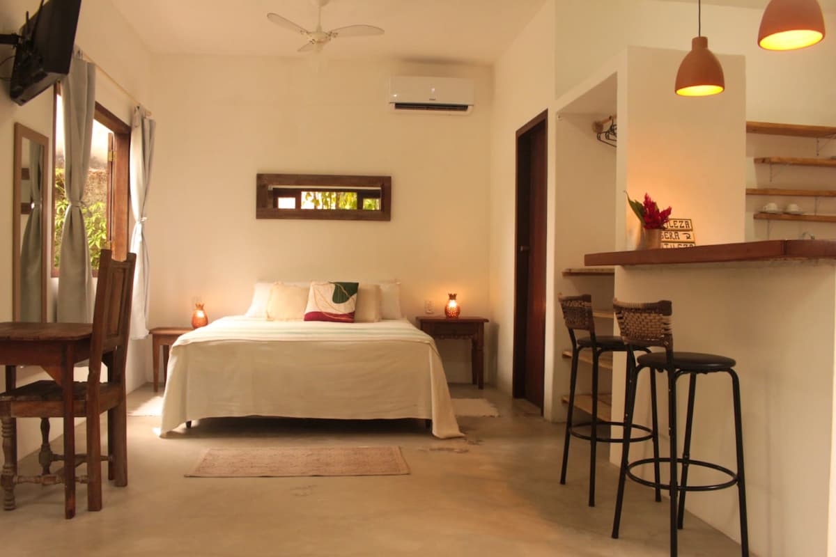 ¡Te damos la bienvenida a Dengo Trancoso Village! Hemos creado un espacio acogedor y encantador, donde cada detalle te hace sentir como en casa. Estamos ubicados a solo 900 metros del Quadrado y a 1 km de las impresionantes Praias dos Coqueiros y Nativos. Nuestro entorno tiene una cocina completa, un dormitorio con aire acondicionado, TV inteligente, wifi, cama tamaño queen, ropa de cama y baño y una oficina en casa. Además, tenemos una zona exterior privada, rodeada de un hermoso jardín y un balcón con hamaca. @viladengotrancoso