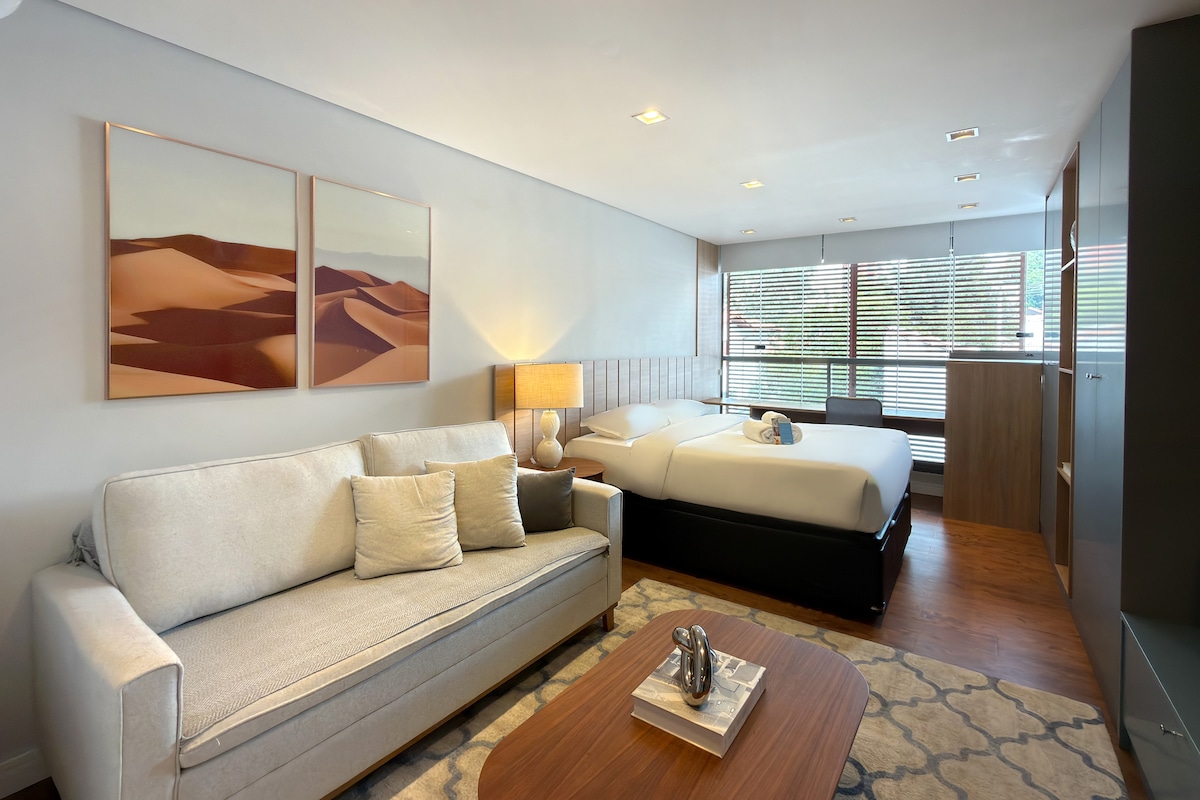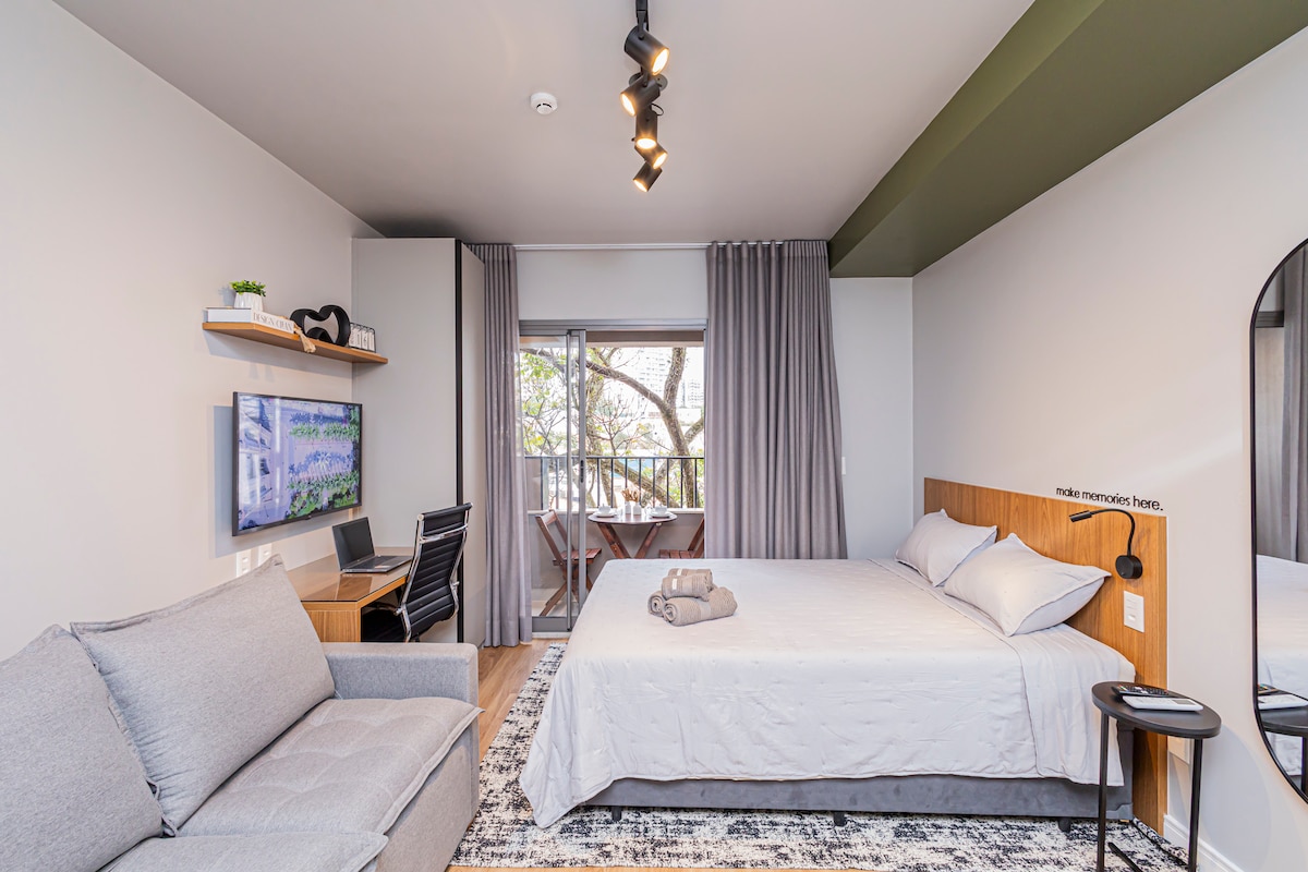 Compacto y funcional el studio tiene todo lo que necesitas para una estadía cómoda Cuenta con aire acondicionado, Smart TV y Wi-Fi Cocina compacta y equipada con cooktop, horno, refrigerador, microondas y demás utensilios necesarios Ropa de cama y toallas también incluidas en la estadía Check-in con cerradura digital Portería 24 horas. Ofrece comodidades como lavandería (con costo adicional), piscina y coworking Panaderías, farmacias y restaurantes están muy cerca Y a solo 200 metros del metro