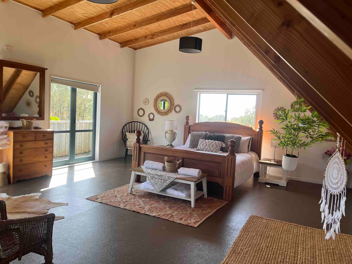 Rewarewa Retreat is a modern studio, and the upstairs bedroom of our family home, with its own private entrance, ensuite, kitchenette and deck. Located on the Rangitahi Peninsula with uninterrupted views of one of Raglan’s beautiful estuaries, it’s the perfect spot to unwind and relax. A 2 min walk to The Hut cafe, a 5 min drive or 20 min walk to the funky harbourside township, and a 10 min drive to the ocean beaches, and our famous surfing left hand break. Check our Insta: rewarewa_retreat