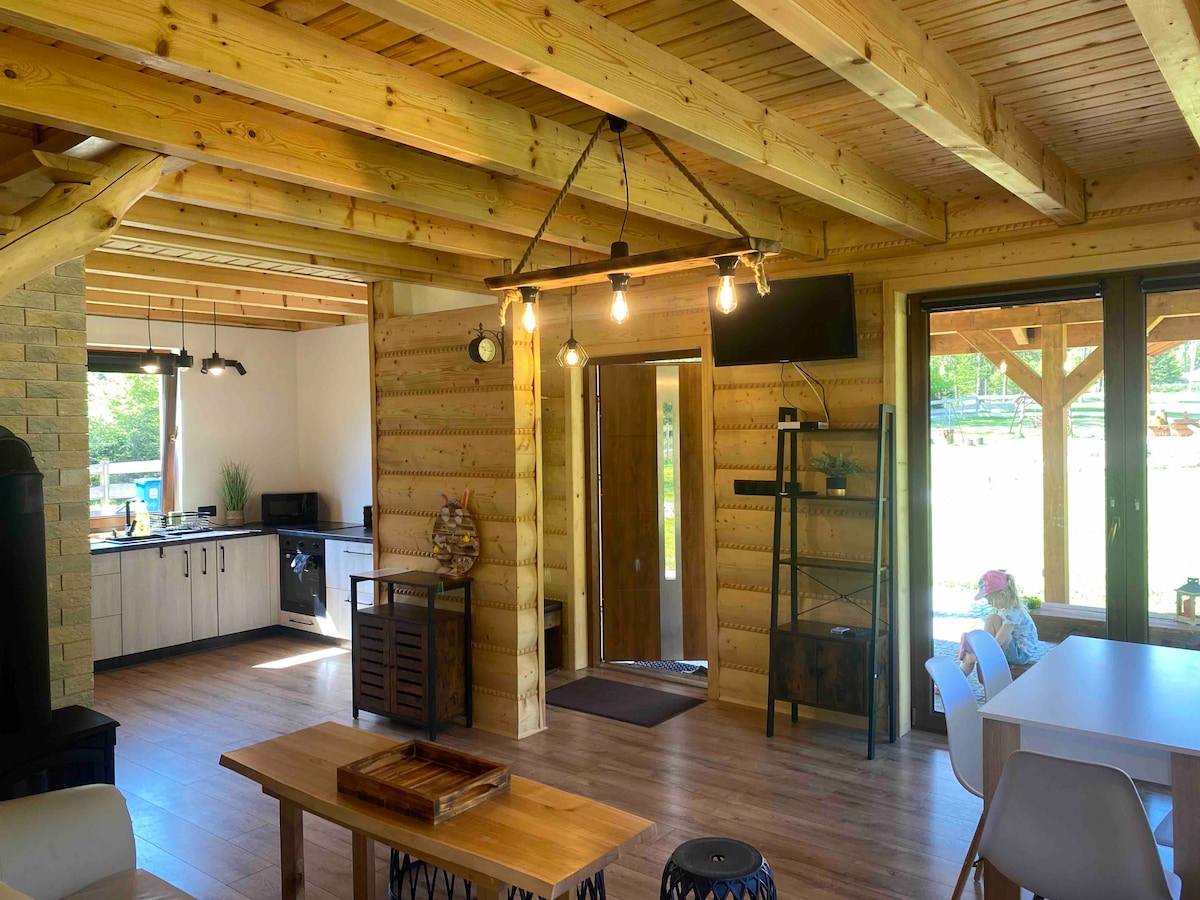 Construido con nuestras propias manos desde los cimientos hasta los muebles interiores hechos a mano. Alrededores de la casa arreglados para su comodidad: terraza con tumbonas y bañeras para bañarse en verano, bañera con agua caliente para los días de primavera y otoño, asientos al aire libre en una terraza parcialmente cubierta junto a un pequeño estanque, espacio para hacer barbacoas o asar. Y vegetación plantada por todas partes. Quería que los huéspedes experimentaran la calidad y la comodidad a primera vista y en su propia piel.