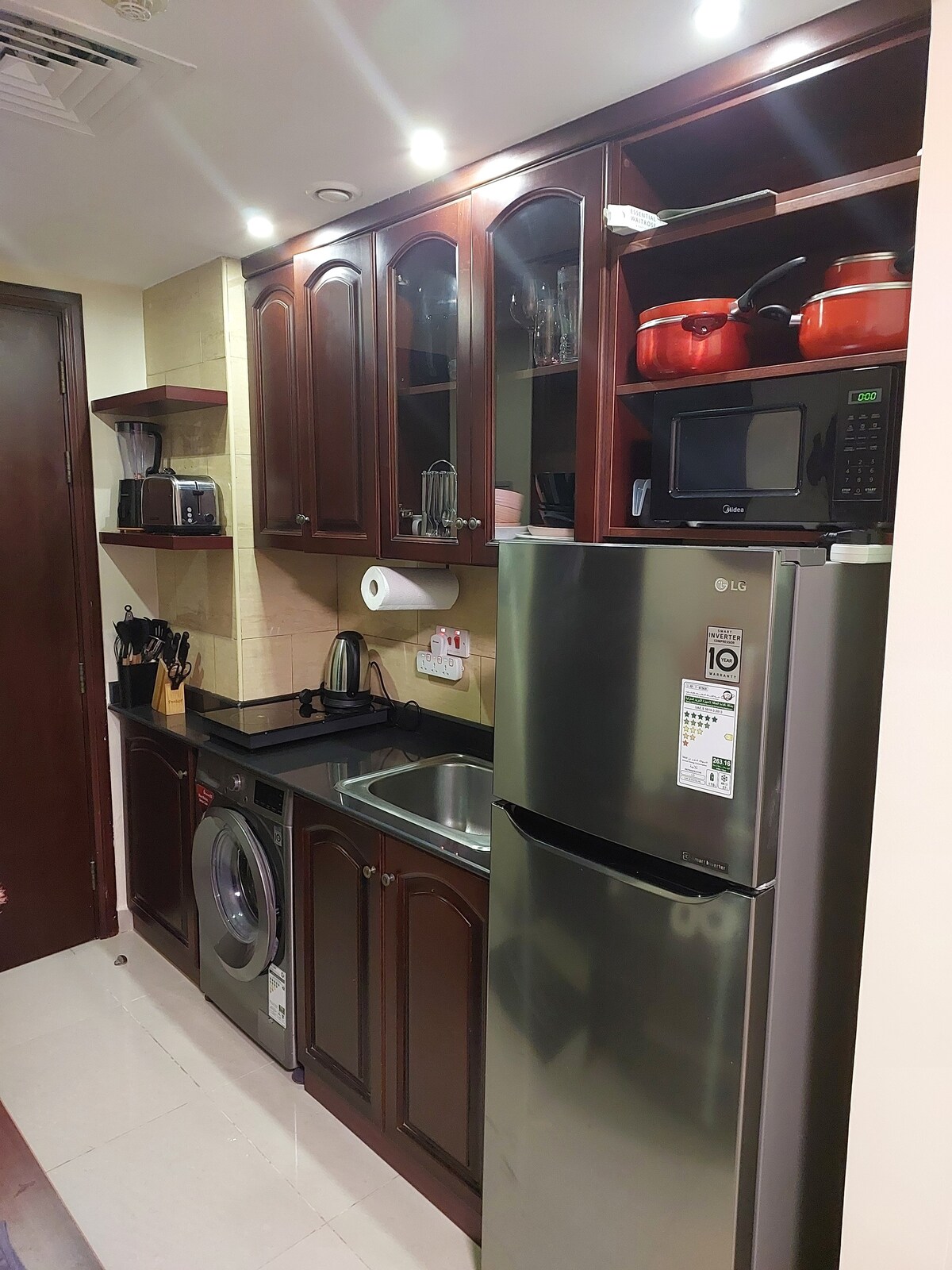El apartamento de playa tiene todo lo necesario para que te sientas acogedor. Totalmente equipado, con increíbles vistas al golfo Arábigo. Está cerca de muchos restaurantes y bares, opciones deportivas y de ocio, hermosas playas, spas y tiendas. Un televisor inteligente y WIFI súper rápido. El estudio es nuevo. Tiene muebles nuevos y una cama cómoda a estrenar. Hay una cocina completa con nevera y lavadora.
