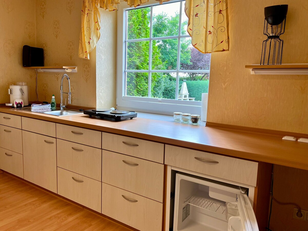 En la zona cerrada de nuestra casa. Ambiente agradable gracias al yeso de arcilla+madera; entorno precioso, muy tranquilo. y cerca: Ratzeburg (coche 5 min), Lübeck (coche 20 min). Un baño; solo UNA placa de inducción rápida, cocina sencilla, nevera, wifi. Cama doble (160x200). Además, mesa y sillas en el jardín. Bicicletas gratuitas. Autobús en B207 desvío Buchholz. Muy rápido en el lago, navegación. No se admiten animales ni se puede fumar. Telefonía limitada en la casa por el yeso de arcilla dependiendo del proveedor.