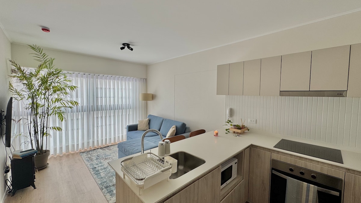 Modern apartment with balcony and panoramic city view. Enjoy a 55" Smart TV with Netflix and Disney+, fast Wi-Fi, a fully equipped kitchen with water filter and espresso coffee station. Queen bed, washer-dryer, home office space, smartkey and 24/7 self check-in. Perfect for remote work, business trips, or long stays.