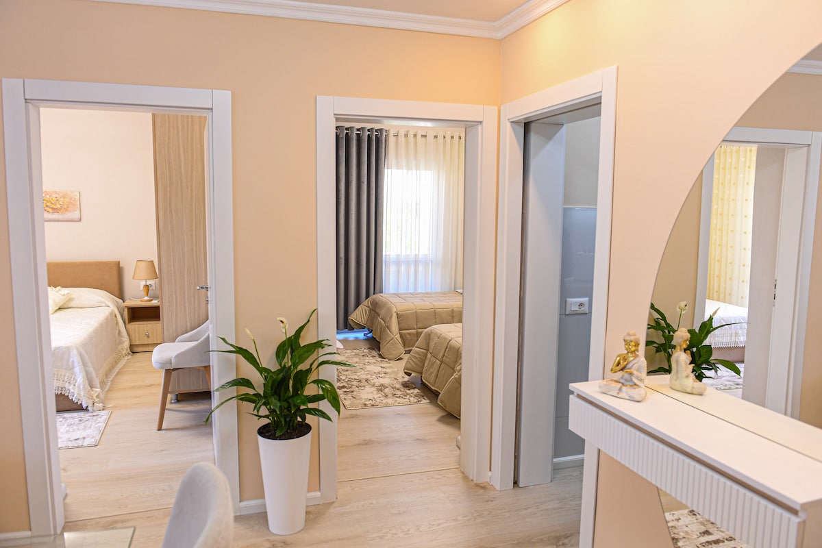 Bienvenido a nuestro acogedor y moderno Apart Hotel ubicado en el corazón de Shkoder, Albania. Perfecto para parejas o familias pequeñas, nuestro espacio contemporáneo de 75 m² ofrece todo lo necesario para una estancia cómoda. También organizamos viajes inolvidables al río Shala/lago Komani, Theth y Valbone, para que puedas experimentar fácilmente la belleza de los Alpes albaneses durante tu estancia.