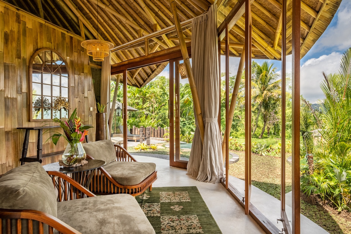 🌿 Adults-Only (14+) | Private Bamboo Villa with Plunge Pool Experience ultimate privacy and luxury in Samudra Villa, our largest and most secluded bamboo retreat at Samanvaya Resort. Featuring a private plunge pool, a stunning copper bathtub, and breathtaking rice field views, this villa blends Balinese architecture with modern comfort. Relax with air conditioning, a stocked minibar, tea/coffee facilities, and an open-concept tropical bathroom—a peaceful and romantic escape in Sidemen Valley.