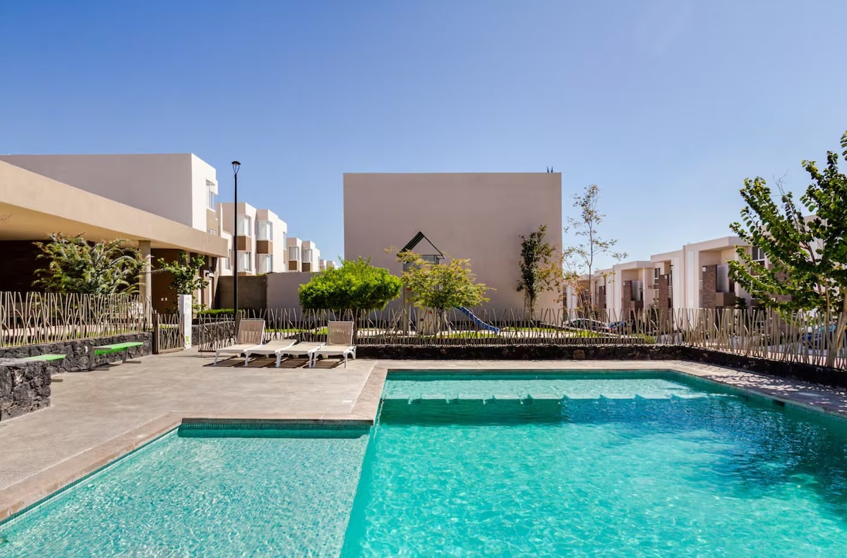 💵 Facturación Disponible 💵 🌿Refugio con estilo en Querétaro🌿 🛏️ 2 Recámaras | 2 Baños. ⭐Recámara principal Cama King baño privado. ✨Segunda recámara: Cama Queen 👶 Cuna disponible bajo solicitud Espacios Comunes 🎥 Sala de TV: Pantalla de 65" con acceso a streaming. 🍳 Cocina: Totalmente equipada para tu comodidad 🌿 Patio trasero: Tranquilo y acogedor, ideal para relajarse Amenidades 🏊 Alberca 💪 Gimnasio 🏀 Cancha de baloncesto 🎡 Área de juegos para niños ✨ Cosmos Homes Quality