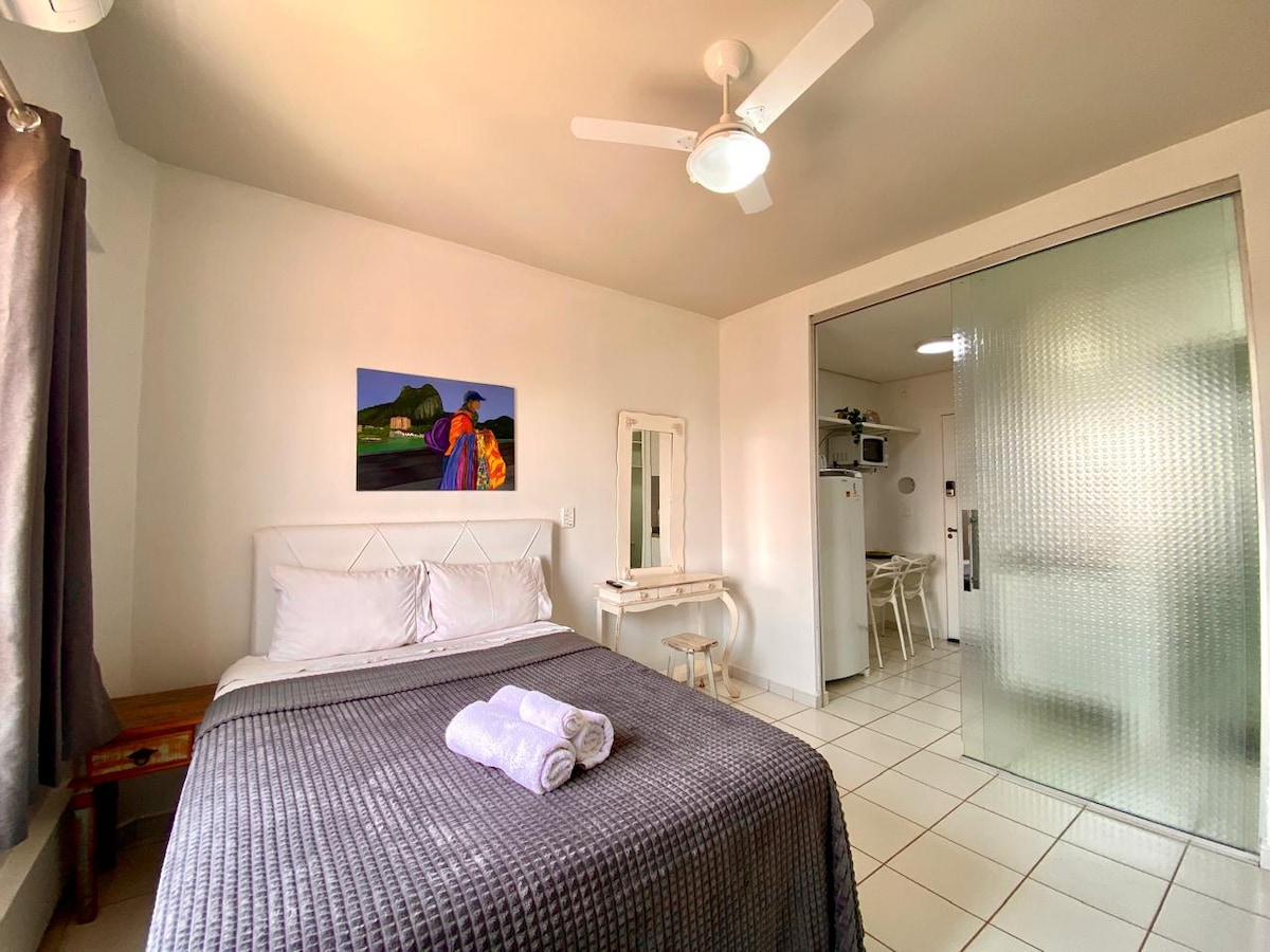Relájese en este lugar único y tranquilo. Estudio completo con wifi, smart TV, aire acondicionado, Alexa, utensilios de cocina, cafetera, filtro de agua, secador de pelo, plancha y todo lo necesario para su comodidad. Puedes elegir entre 2 camas individuales o 1 cama queen. Disfrute de las áreas comunes como piscina, ascensor, estacionamiento, lavandería, conserjería 24 horas, sala de estudio o reuniones y espacio gourmet. Excelente ubicación, cerca del Hospital São Francisco y Faculdade UNAERP.
