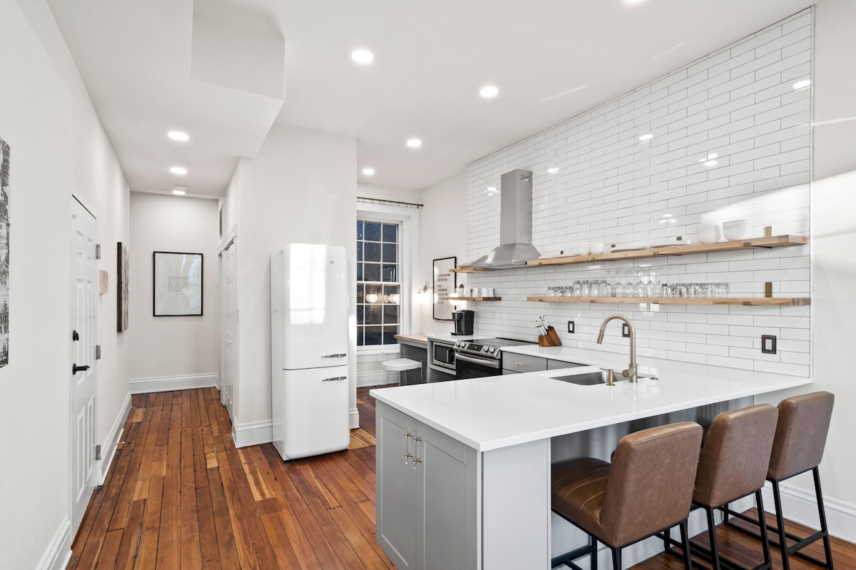¡Te damos la bienvenida a Sixteen West! Este elegante y moderno departamento se encuentra en el corazón del histórico Jackson Ward. Recientemente renovado, el espacio cuenta con hermosos pisos de madera, accesorios de iluminación actualizados y una cocina elegante y totalmente equipada. Estarás a pocos pasos de algunos de los mejores lugares de Richmond, como Tarrant's Café, Quirk Hotel, The National y más. Por favor, ten en cuenta que esta unidad requiere subir 2,5 tramos de escaleras, NO HAY ASCENSOR.