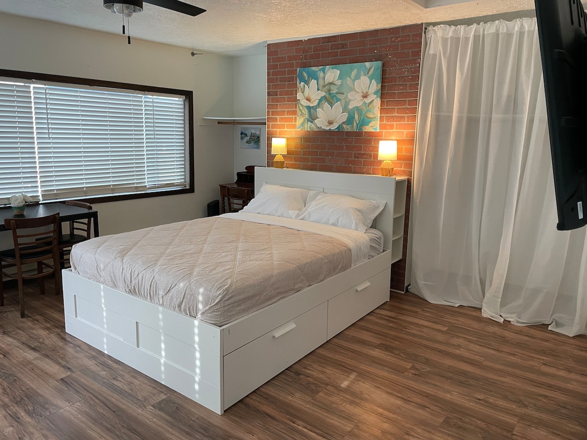 Estudio independiente con entrada privada y baño, limpio, cómodo, totalmente amueblado, moderno y luminoso con wifi Starlink. Colchón de espuma viscoelástica de gel de 14 pulgadas de última generación con una cubierta de 2 pulgadas de Ikea con elegantes almohadas y mantas acogedoras. Ven a relajarte, aléjate de todo en nuestra tranquila propiedad de 1 acre. Este espacio está diseñado pensando en nuestros seres queridos, por lo que quien venga y se quede disfrutará de la mejor experiencia posible. Suelos modernos, pintura, accesorios de baño y una cocina americana totalmente equipada.