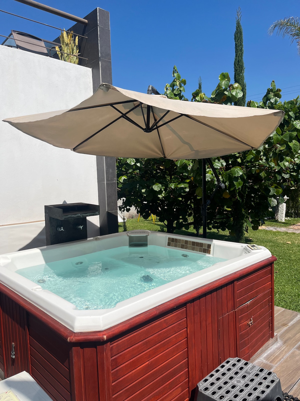 Es una Villa totalmente nueva puedes hacer uso de toda la propiedad de 1000 mts2 donde ademas de la casa encontraras diferentes áreas dentro de la propiedad como el area de jacuzzi con agua caliente con capacidad de hasta 5 personas, área de fogata, un área de asador de gas, baños en el exterior para evento o una reunión, área con juegos infantiles, mini cancha de fútbol con pasto natural, área de relajación con fuente, NO SE PERMITEN FIESTAS O EVENTOS ni el ingreso de personas no incluidas