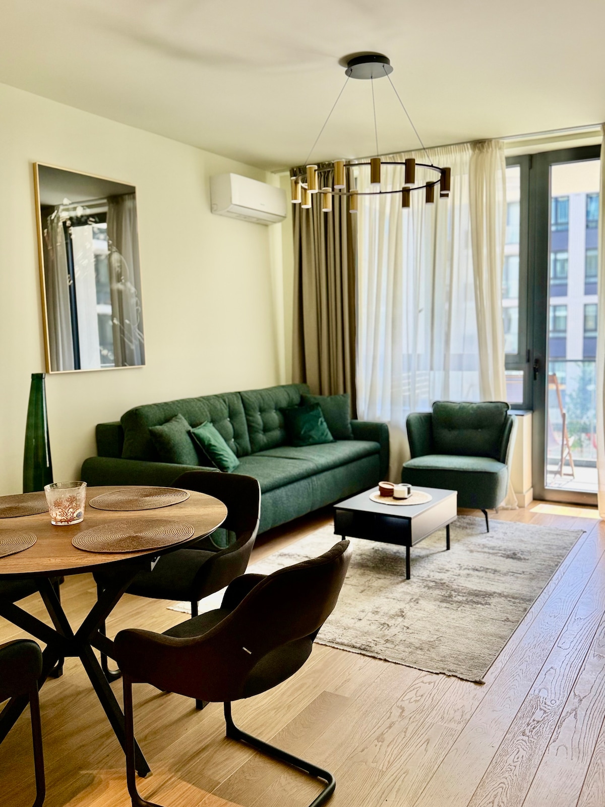 I am really thrilled to share my first apartment with you. It's cozy, in a very quiet and safe neighborhood overlooking a park. It has a separate bedroom, spacious open-space concept with living room, dining room table and kitchen and a newly renovated bathroom. You can enjoy a night close to the electric fireplace or take a walk around the block surrounded by trees.