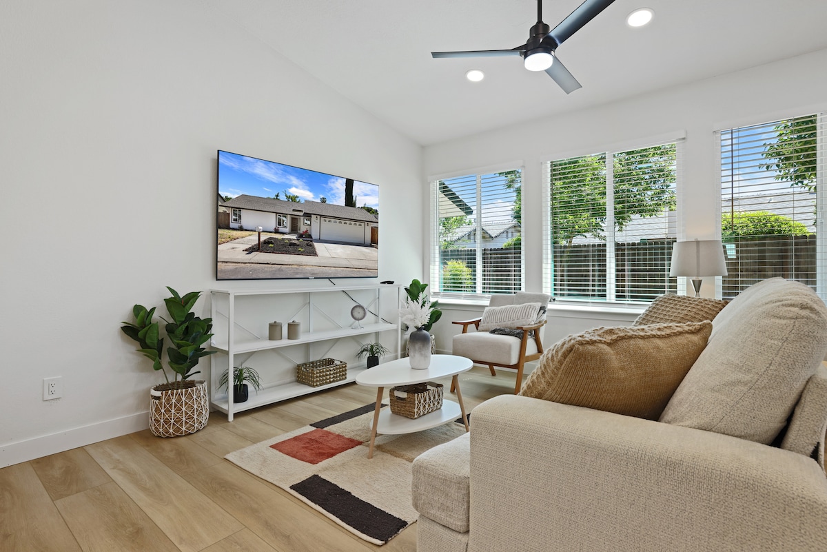 Esta es una casa dúplex de 2 dormitorios y un baño recién reformada. Con todos los muebles y electrodomésticos nuevos, decoraciones de buen gusto, un televisor de 72 pulgadas con barra de sonido y subwoofer, ¡es posible que no quieras irte! Estamos en una ubicación céntrica, a una manzana de restaurantes, hoteles y tiendas, es la ubicación perfecta para viajes de negocios o placer. Estamos a una manzana de la autopista 120/108, por lo que es conveniente, pero a la hora pico es probable que escuches algo de tráfico. Lavadora/secadora en el garaje. Por favor, deja tus zapatos en la puerta.