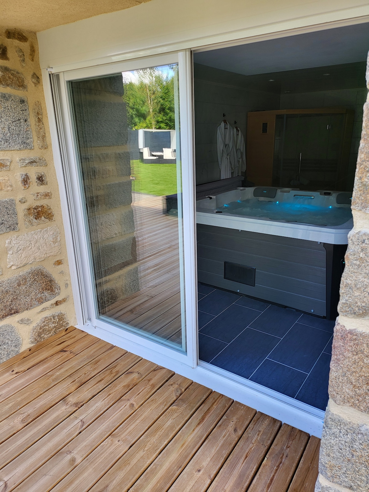 Le Gîte vous propose un hébergement avec une piscine intérieur chauffée, une cabine de sauna et un jacuzzi 5 places ainsi qu'une salle de sport. La maison comprend à l'étage 1 suite parentale avec salle de bain comprenant une baignoire balnéo, un salon cosy équipé d'un canapé lit et au rdc, 1 grande chambre avec 1 lit double et 1 canapé lit, 1 sdb avec douche à l'italienne, 1 salle à manger avec 1 poêle à bois et une cuisine entièrement équipée. Les serviettes et linge de lit sont fournis.