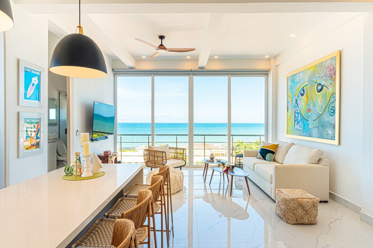 Relájate y disfruta de un hermoso atardecer, la brisa y una vista panorámica del Mar Caribe desde tu lujoso apartamento con terraza privada en Cartagena, en un piso 14 y primera línea de playa. Te hospedarás en Cartagena Beach Resort & Residences, un proyecto moderno, con amplias zonas húmedas y ubicado estratégicamente frente a la playa, Parque Lineal de Crespo, aeropuerto, comercios y a menos de 15 mins en Uber del Centro Histórico, Getsemaní y a las playas más bellas de la ciudad.