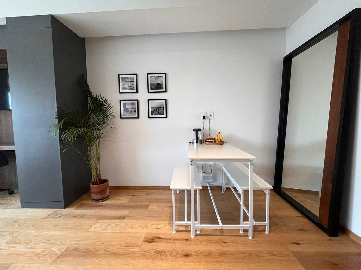El departamento cuenta con una chimenea en la habitación, un jardín zen en creación y PRIVADO con el cual podrás hacer fotografías. El espacio de 60m2 cuenta con una cocineta para calentar y hacer alientos así como un gran refrigerador para el almacenamiento de bebidas y alimentos, microondas y cristalería y loza de primera. El baño en la habitación es contemporáneo con regadera de lluvia. El entorno lleno de los mejores, subvenís, restaurantes y museos.