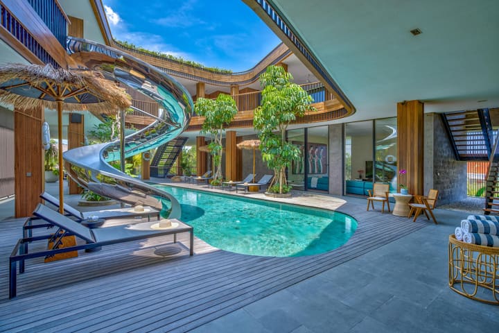 Disfruta de acceso completo a las habitaciones y comodidades de la villa de tres plantas: esto incluye los seis dormitorios con baño privado, una piscina privada con tobogán escultórico, así como todas las áreas interiores y exteriores dentro de la propiedad de 2000 metros cuadrados.