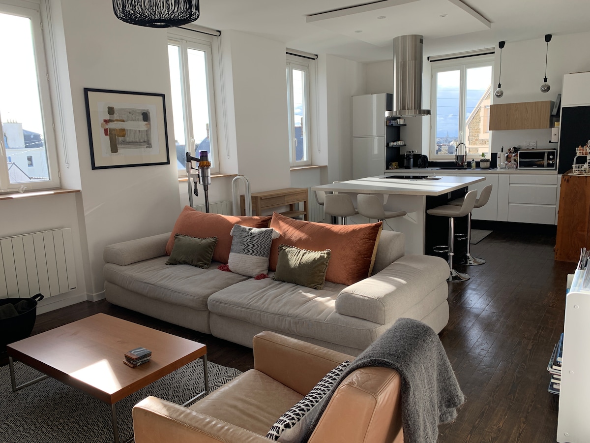Large and bright apartment of 42 m², under the roof, in a quiet street in the centre of St-Servan. Ideally located, "close to everything", between the sea (200 m from the beaches), shops and restaurants (100 m from the centre) and 500 m from the town centre. Completely refurbished in early 2021. Mezannine with a bed of 160. Fully equipped kitchen. Independent bathroom (shower). It has all the facilities and comfort for an unforgettable stay in the Malouin country. Easy and free parking.