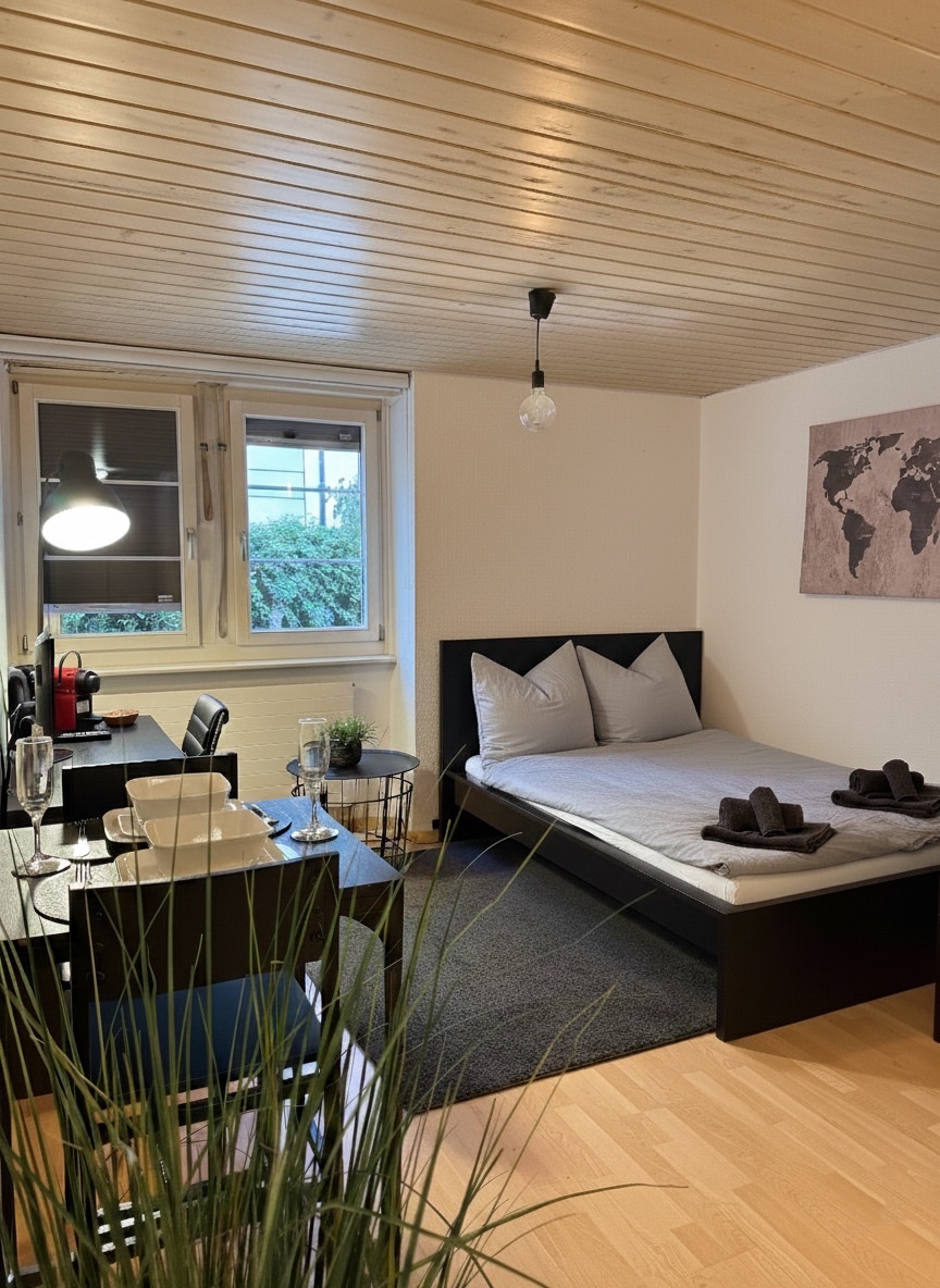 Privates Studio mit separatem Eingang und eigener Rooftop-Terrasse (30 m2) mit atemberaubender Sicht an sehr diskreter Lage. Geniessen Sie eine herrliche Auszeit zu zweit. Das Studio (40 m2) verfügt über einen Eingangsbereich, ein eingerichtetes Wohnzimmer mit vollfunktionsfähiger Kochzeile, Bad mit Walk-in Dusche, und dem Schlafbereich mit Doppelbett direkt an der Fensterfront. Erweckt Schwebe-Eindruck über dem Wasser. Seit November 2025 Smart TV mit Netflix E-Trike Erlebnis optional verfügbar