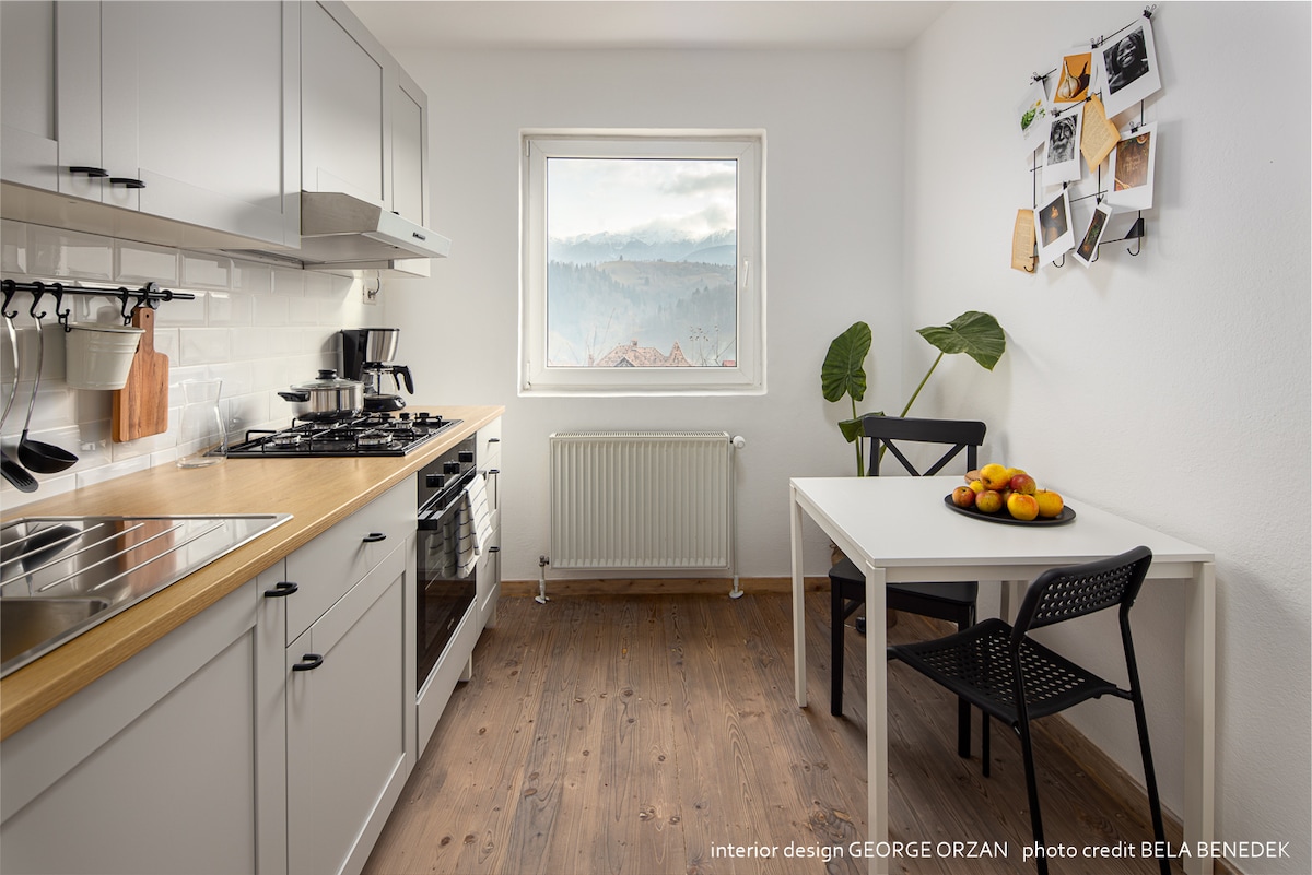 Located right at the outskirts of the busy and lively city center of Brasov, Isolina Rooftop is a new, luxurious, one-bedroom apartment with a huge terrace that offers a stunning view over the city and the surrounding mountains. We recommend our new location for those in search for a romantic weekend, a cozy retreat for two, a quiet and lovely location that you'll always want to revisit while in Brasov.