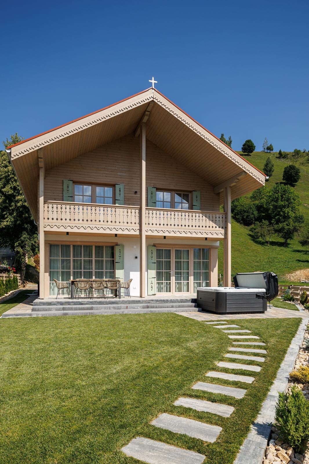 The cottage has a beautiful living area and a fully equipped kitchen, as well as a fireplace. It is extremely charming, the perfect place to enjoy the mountain. Outside there is a beautiful courtyard with an outdoor terrace and lounge area for guests, a barbecue. A lovely stream runs through the property. There is also a playground for children, 2 hammocks, a swing and a relaxation area for adults - heated jacuzzi (which is paid extra upon request). It is the perfect place for a great vacation.