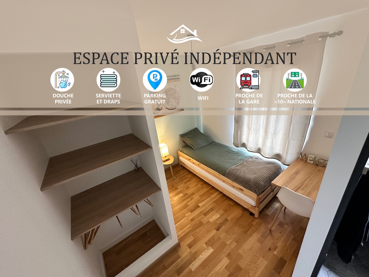 Acondicionado en el granero contiguo a la casa principal de Charente situada en el centro de la ciudad de Ruelle sur Touvre, en una calle muy tranquila, estudio independiente cómodo, reciente y decorado con cuidado.Disfrutará de la tranquilidad y la vegetación de un entorno rural en la ciudad. Todas las comodidades a pie, el centro de la ciudad de Angoulême a 5 minutos en coche, acceso directo a la carretera de circunvalación, autobús cercano. También podrá disfrutar del agradable jardín y de la piscina compartida (no climatizada).