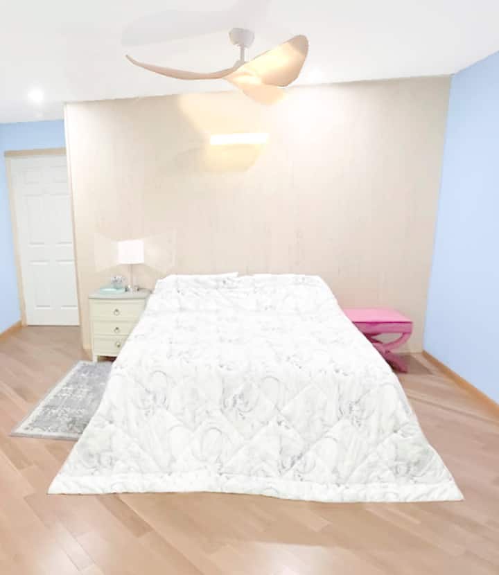 ¡Amplia habitación en tonos púrpura, junto al estadio y un dulce gato!