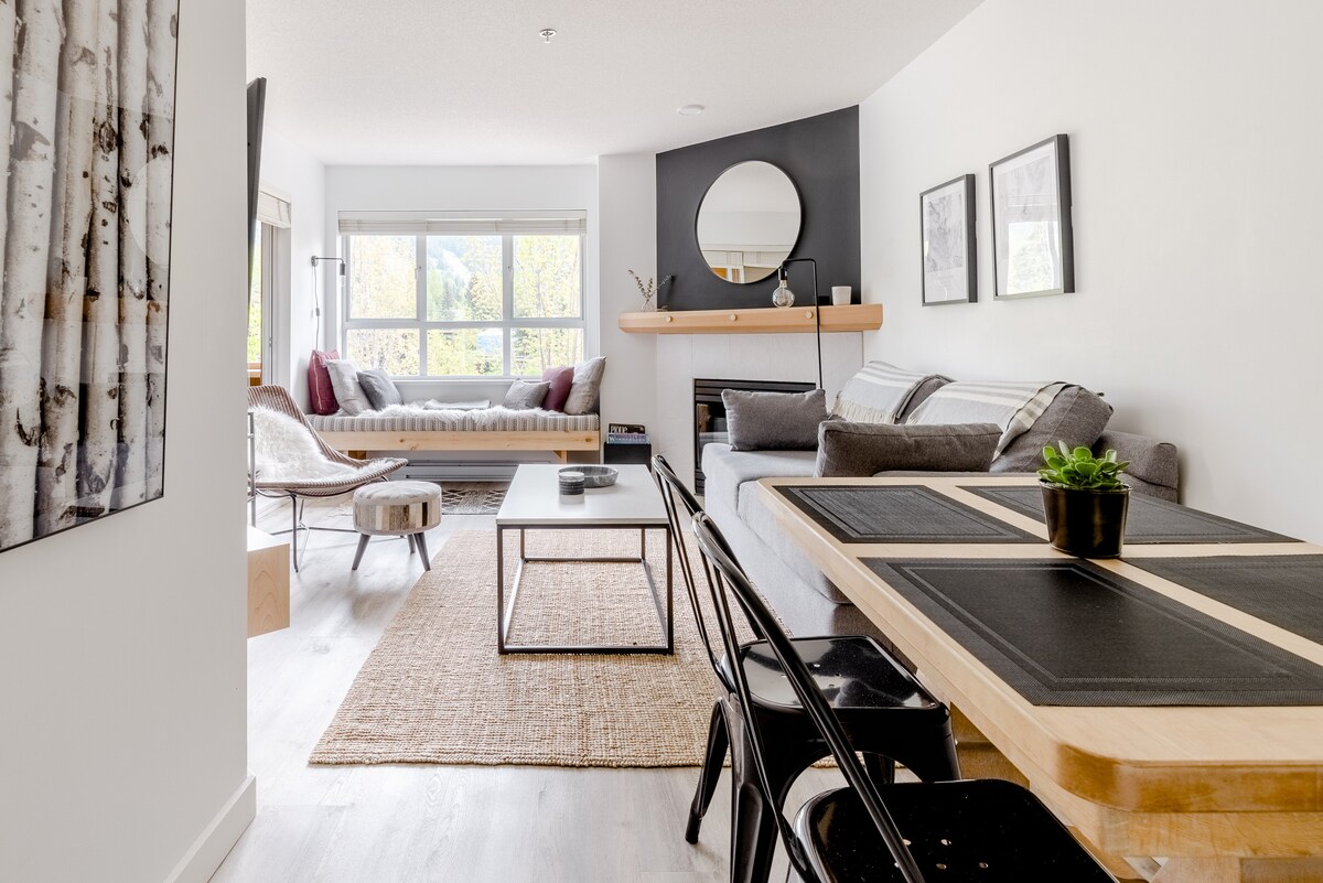 Moderno Scandi 1 bd en tranquilo Creekside. 3 min a pie de la góndola. Junto al Valley Trail. Pisos con calefacción, ducha de lluvia, televisor inteligente de 50", wifi de alta velocidad, chimenea, portaesquís privado y estacionamiento GRATUITO. Creekside Village al otro lado de la calle para alquiler de bicicletas, comestibles, gimnasio... Elige entre restaurantes elegantes (Rimrock, Red Door, Mekong), comida casera (South Side, Creekbread), pubs (Roland's, Dusty's) y cafés (BReD, Rockit). A 7 minutos en auto/autobús de Main Whistler Village. El transporte público está a 2 minutos de la puerta.