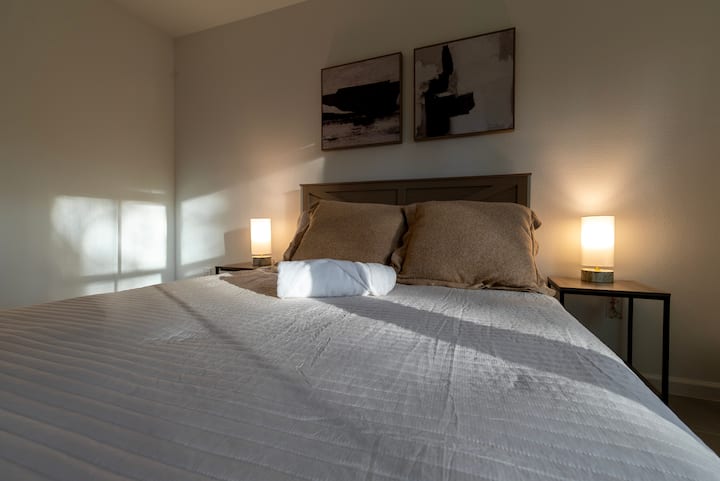 Acogedor dormitorio con cama tamaño queen y baño compartido