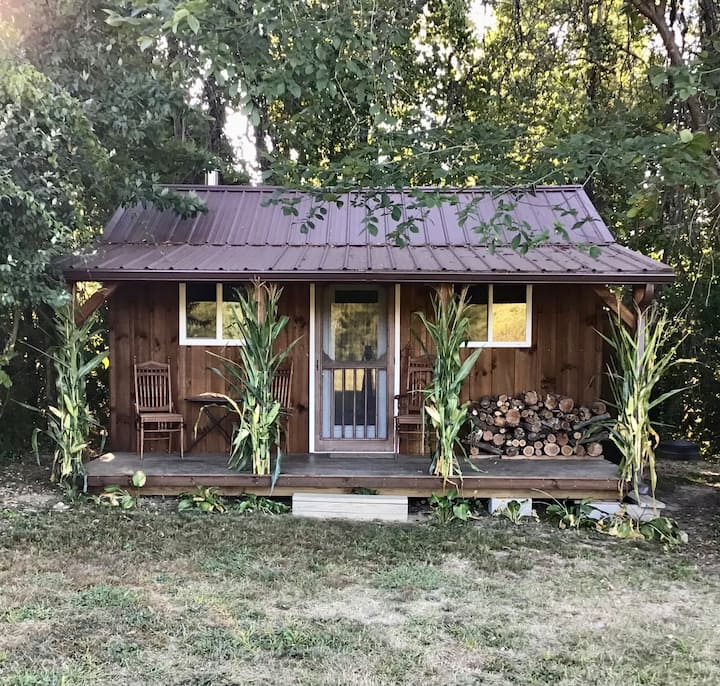 Pequeña cabaña primitiva en el bosque nacional Wayne