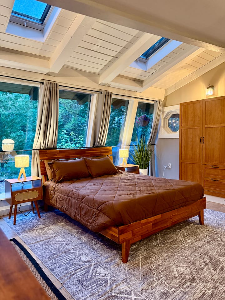 Habitación luminosa con cama tamaño queen