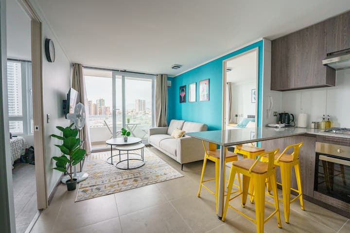 Acogedor departamento frente al mar, excelente ubicación, con estacionamiento y a pasos de pubs, restaurantes, mall, supermercados y casino.