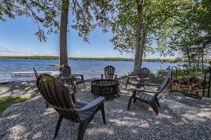 Frente al lago, kayaks, muelle, chimenea, playa de arena, Acadia