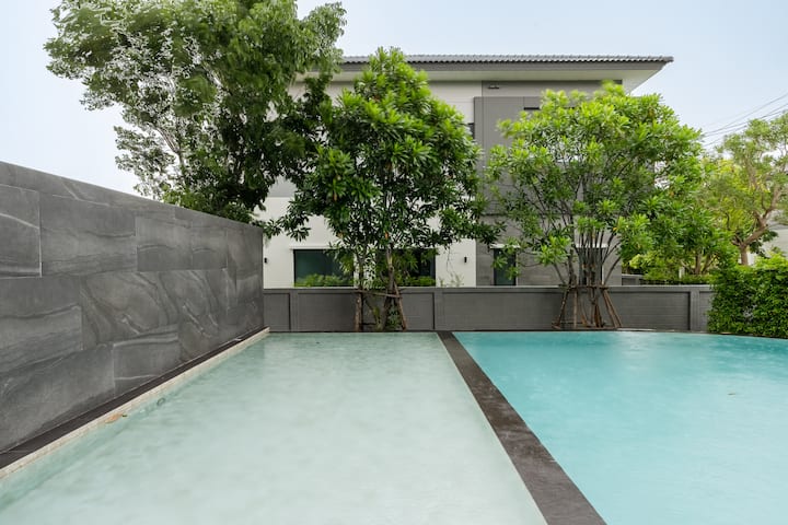 Estancia con vistas a la piscina y espacio de trabajo privado en Mahidol
