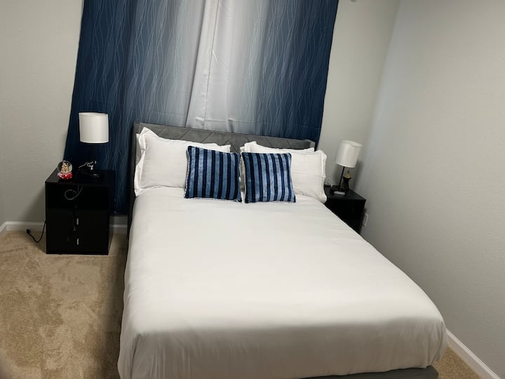 Dormitorio privado tranquilo y acogedor con una cama tamaño queen.