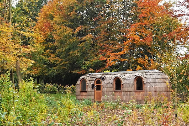 Acogedora, diseñada y glamurosa cabaña de madera en la naturaleza.