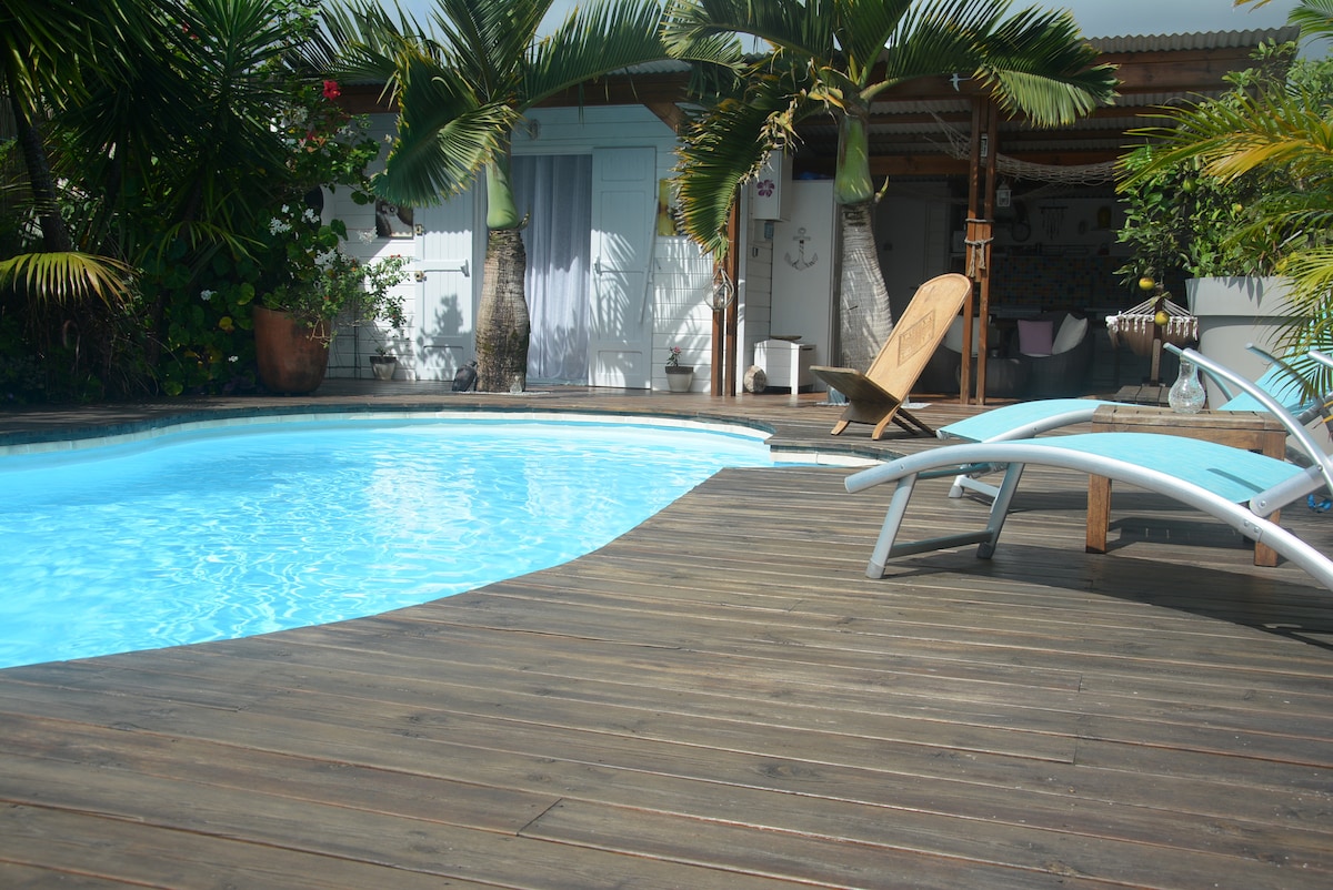 Buscando un pequeño rincón criollo original o un poco fuera de lugar en un ambiente familiar criollo, Vien a zot = ¡Bienvenido! Equipado con 4 habitaciones para una superficie de 30m2 , a saber, un dormitorio con aire acondicionado con cama de 2 plazas + 1 cama supletoria, 1 armario 1 cómoda y 2 lámparas criollas, una ducha italiana de inodoro de un lavabo ( lavadora opcional a 5 eur) y un pequeño patio. Con cocina americana abierta. Así como una terraza cubierta con vistas a la nueva piscina privada de agua salada de 20 m2