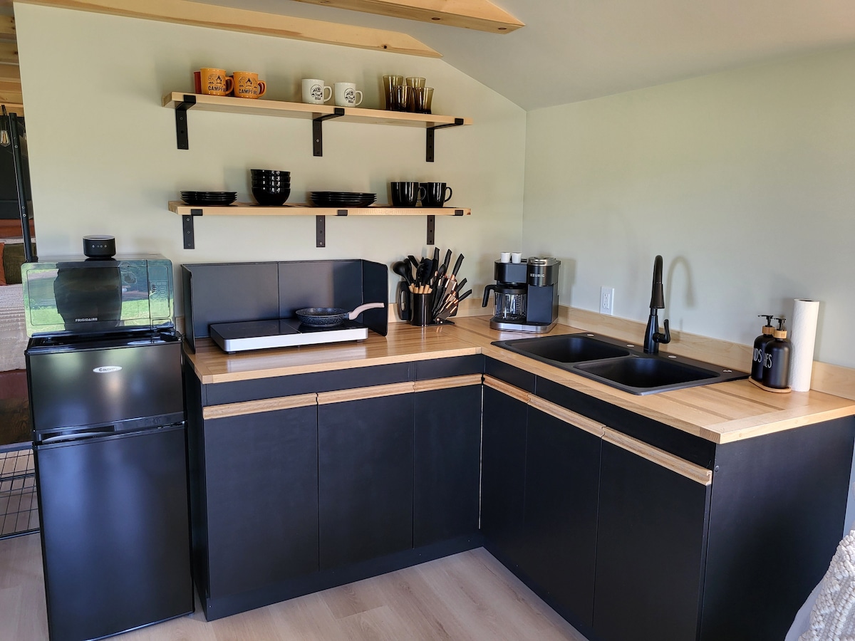 ¡Disfruta de una escapada única frente al mar en nuestro campamento de contenedores de transporte! Nuestros contenedores de transporte convertidos se han transformado en acogedoras y modernas cabañas, cada una con impresionantes vistas al agua. Con kayaks en el lugar y un muelle privado, puedes sumergirte en aventuras acuáticas justo desde tu puerta. Dentro de tu contenedor, encontrarás un elegante espacio habitable con una cómoda cama, una cocina compacta y un baño moderno. Relájate en el jacuzzi o reúnete alrededor del fuego para disfrutar de una noche de observación de estrellas.