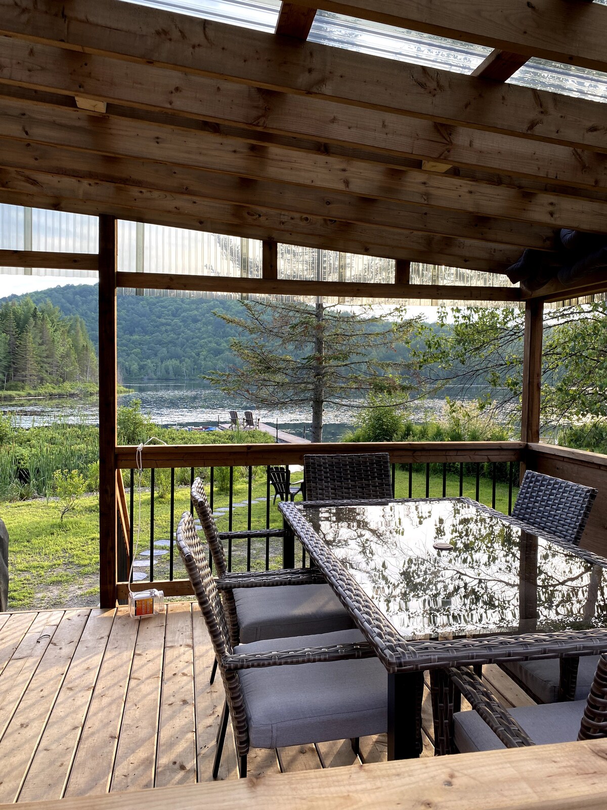 Un spa couvert est maintenant disponible pour rendre votre séjour encore plus agréable. Chalet pour les petites familles Parfait pour 3 couples avec enfants À 1h30 de Montréal et 2h de Qc Bord de lac écologique sans moteur 3 chambres fermées 2 salles de bain et 1 salle d'eau Grands espaces communs (îlot, grande table à manger) Foyer au bois à l’intérieur Véranda avec moustiquaire Wifi haute vitesse Articles de bébé (parc, chaise haute, réhausseur et+) Numéro de CITQ 295755