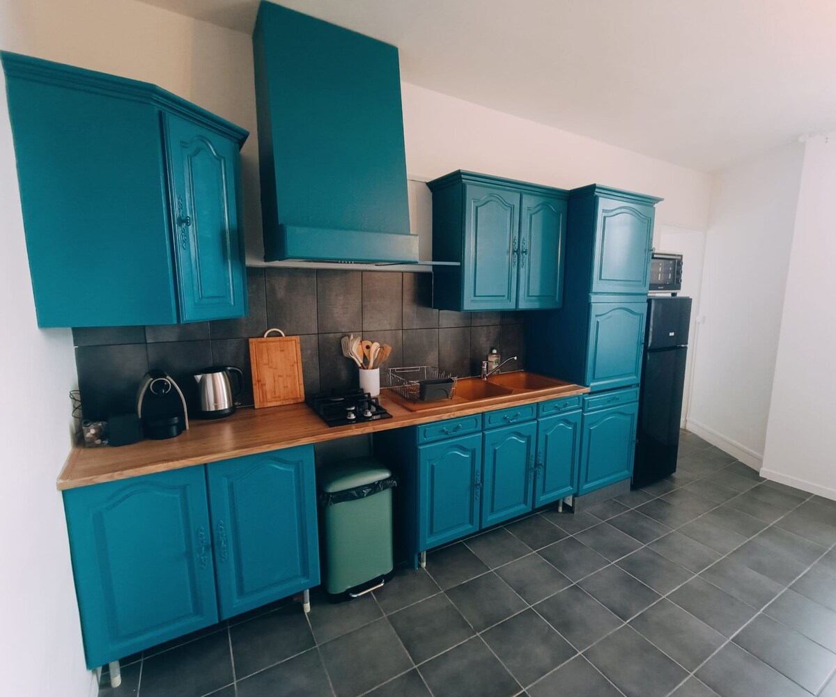 Venga a descansar tranquilamente en nuestra casa en plena campiña. Disfrute de una habitación espaciosa con cocina abierta al salón y comedor con los equipos necesarios (frigorífico, horno, placa de gas, lavavajillas, lavadora, microondas, tostadora). La estufa de leña hará que el ambiente sea aún más cálido y acogedor en invierno. Hay un acceso a la terraza con muebles de jardín, barbacoa y cenador. En la planta superior, el alojamiento incluye 2 camas individuales, una cama doble, baño y aseo.