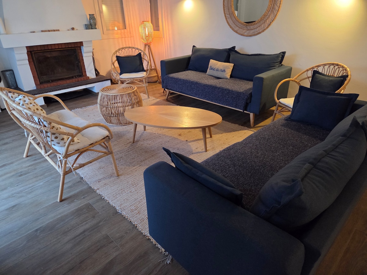 Nuestra villa está situada cerca de la playa, tiendas, piscina, bosque de pinos. ¡Todo a pie! Casa independiente de 157m2, luminosa. Jardín cerrado de 300 m2 con barbacoa de carbón y ducha solar al aire libre. Varias terrazas independientes. Cocina estadounidense/sala de estar con futbolín Petiot y estufa de leña. 5 habitaciones con acceso directo al exterior. 2 aseos independientes y 2 baños. Garaje con mesa de ping ping ping. Suministro de juegos, libros. Internet fibra conserjería
