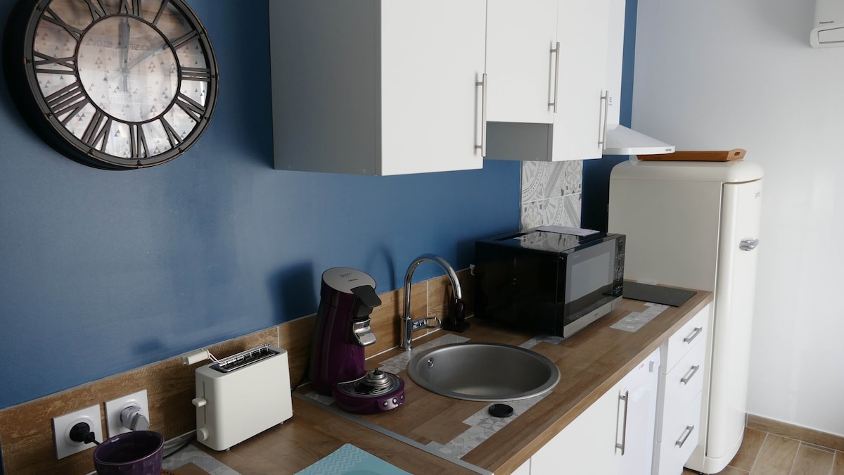 Grand studio dans villa. Cuisine équipée + lave-linge. Douche avec jets massants (linge de toilette fourni) 1 vrai lit 2 pers. 140 cm + 1 clic-clac (linge de lit fourni) Accès au jardin et à la cuisine d'été (barbecue sur demande, four à pizza interdit)Enclos des animaux aux pieds du studio (dont un coq)et 3 chats qui se baladent. 1 place de stationnement. Arrivée à partir de 17h00 en règle générale; mais suivant notre emploi du temps nous pourrons peut-être adapter cet horaire à votre demande.
