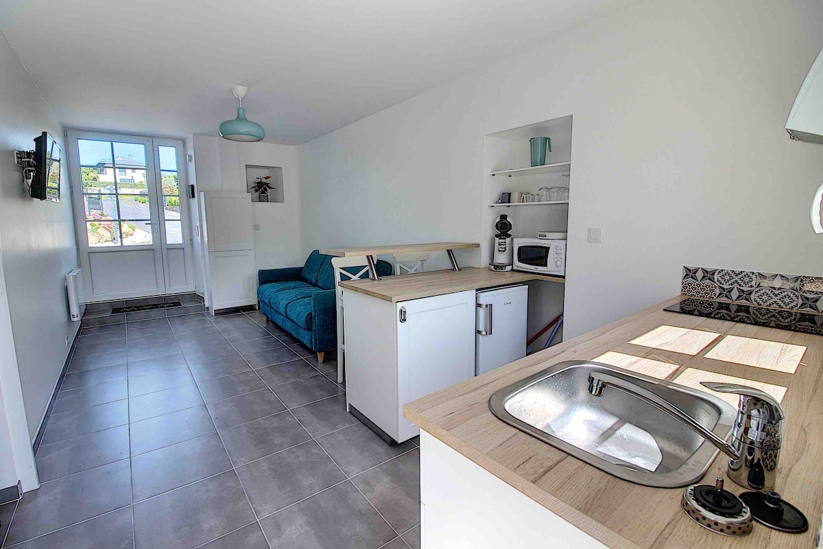 Studio cosy pour 2 adultes, pièce de 25 m2 avec partie salon et partie repas, coin couchage 2 personnes, kitchenette, salle d'eau avec petite douche et WC. Courette de 20 m2 pour stationner. Terrasse de 10 m2 avec accès direct sur l’avenue Vauban et la plage de Carolles à 300m. Bus restaurent, Bar tabac, dépôt de pain en face. Restauration à 300m près de la plage. Café : Dosette plates filtre type Senseo ⚠️ Rue Passante ⚠️
