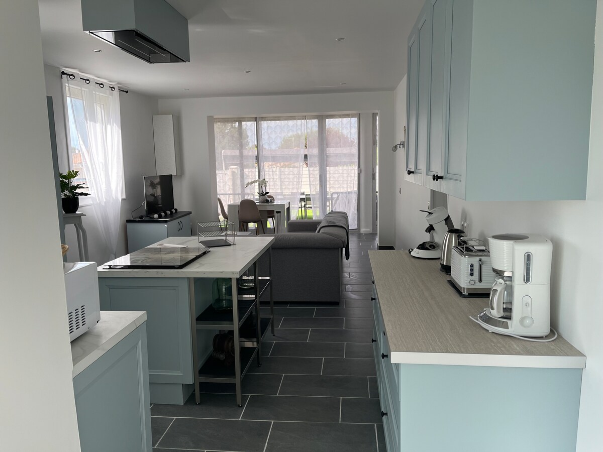 Playa de Nauzan a poca distancia (300 m), nueva villa para 8 personas con 3 dormitorios, 2 baños, 2 aseos, terrazas, cojines al aire libre para relajarse, descansar y convivir. 2 dormitorios (camas de 160 cm) + 1 dormitorio (2 literas de 90 cm + sofá cama) Cocina con placa de inducción, horno, microondas, lavavajillas, nevera-congelador, cafetera Senseo Switch, tostadora, hervidor, exprimidor, lavadora. Wifi, aparcamiento cerrado para varios coches. Cerca del campo de golf y centro ecuestre Maine Gaudin No aceptamos mascotas
