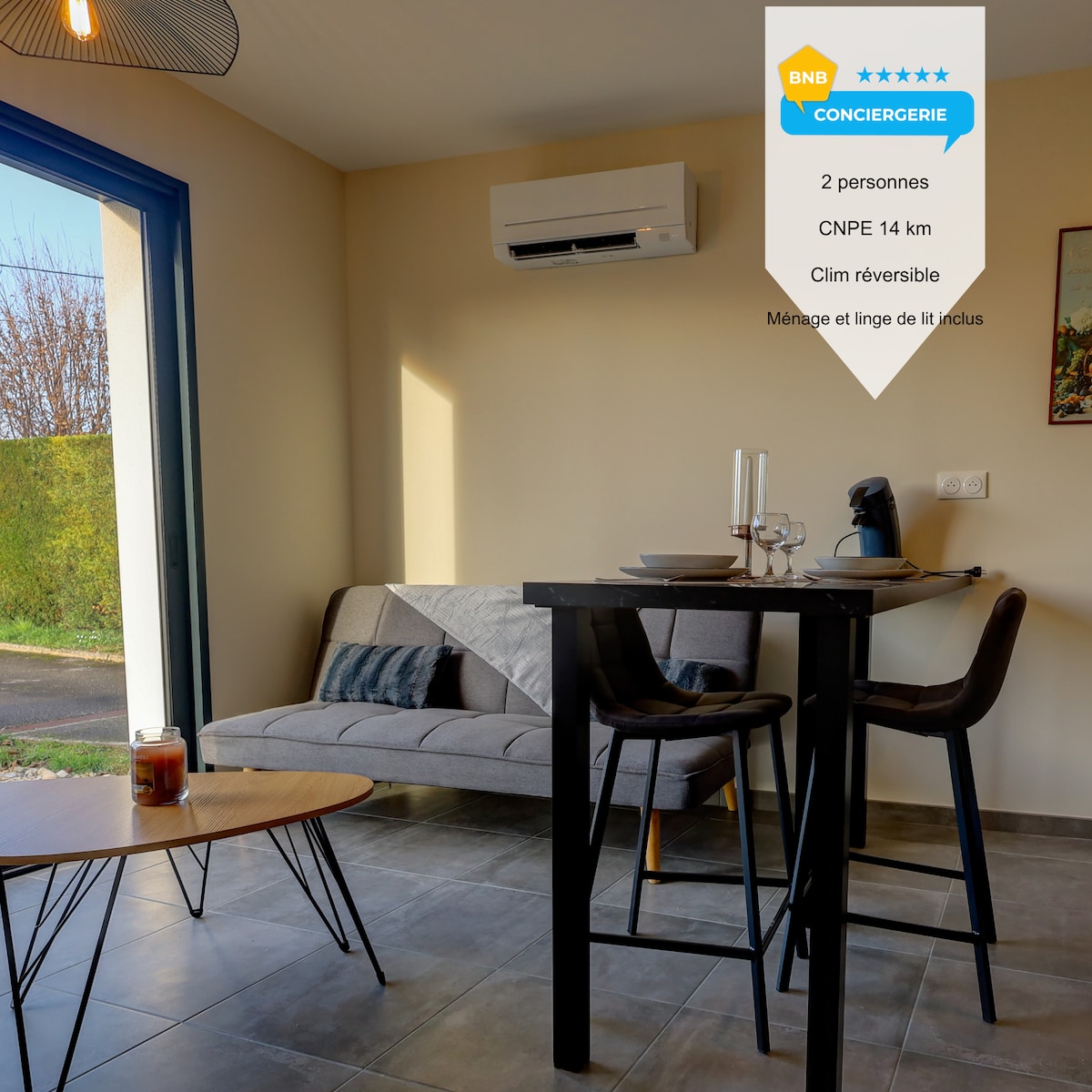 Côté Campagne, un lieu de caractère dans un environnement privilégié. De plain-pied, il est ouvert sur un patio avec salon de jardin et barbecue. Climatisé, il dispose d'une pièce de vie avec canapé convertible. L'espace cuisine est entièrement équipé : lave-vaisselle, lave linge, Nespresso, etc. L'espace nuit est composé d'un lit double 160x200 avec une salle d'eau équipée d'une douche à l'italienne. Votre séjour pourra être agrémenté de séances de SPA privatives à convenir à votre arrivée.