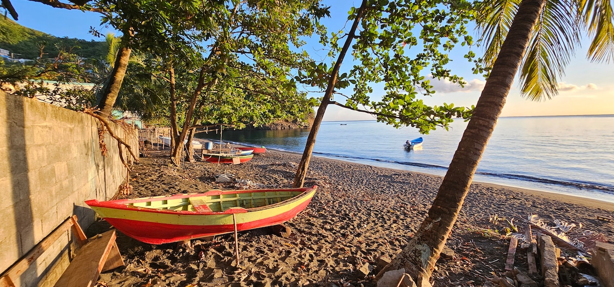 Beautiful west-coast sunsets • AC • Strong Wi-Fi. Perfect for longer stays. Wake up to ocean and mountain views in this airy beach cottage, just steps from the black-sand beach. Savor your favorite drink on a private deck and reconnect with nature or loved ones. Immerse yourself in the authentic Barrouallie experience — a warm, welcoming community and rich culture. With Wi-Fi and A/C, unwind in comfort after exploring the vibrant fishing town and breathtaking surrounding areas.