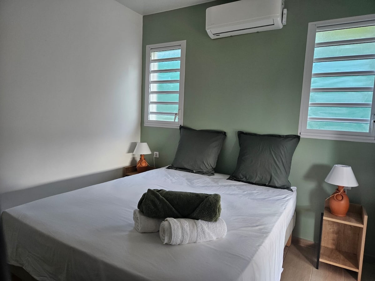 Venga a relajarse en este encantador bungalow. Muy acogedor, encontrará en este bungalow 1 dormitorio con 1 cama y 1 sofá cama. Ideal para 1 pareja y 2 niños si es necesario. Un cuarto de baño y una cocina equipada situada en la terraza como se hace mucho en Martinica. Podrá relajarse en la piscina de 2,50 m por 3 m. Con una ubicación ideal, estará a 10 minutos a pie de la hermosa playa de Mabouya, a 3 minutos en coche de la RN y a 15 km del aeropuerto.