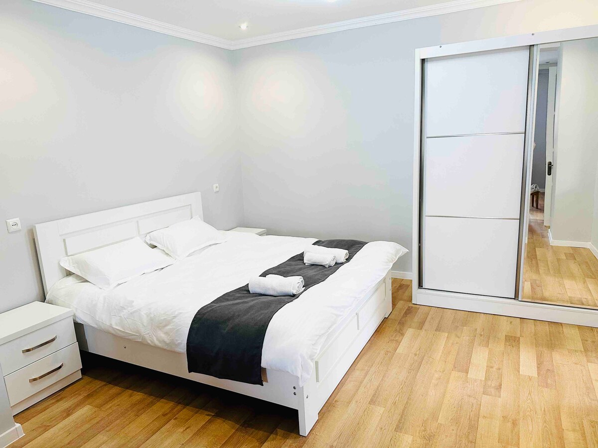 ✨ Spacious 120sqm apartment for up to 8 guests – ideal for families and groups. 3 bedrooms, large living room with sofa bed, 2 bathrooms, fast WiFi & self check-in. Fully equipped kitchen, TV, quiet and comfortable stay in Kutaisi. Prime location surrounded by shops, pharmacies and restaurants for maximum convenience. The bus stop directly in front of the building offers fast connections to the city center and the ✈️ airport (approx. 20 minutes). Located 📍 on the 2rd floor🛗 No elevator.