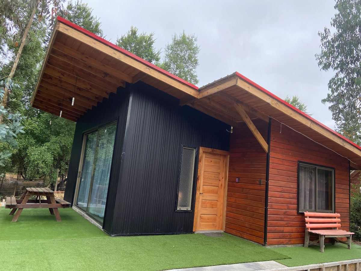 Pequeña cabaña familiar (45mt) en parcela , completamente independiente, 2 dormitorios, 2 baños, estar-comedor, cocina muy equipada para 4 personas. Aire acondicionado y estufa a pellet para calefacción, TV y WiFi. A solo 1 km de la zona urbana, almacén y restaurantes. A 3 km de terminal de buses y supermercado Líder. Muy fácil llegada desde antigua carretera norte-sur o Avenida Las Industrias, principal llegada a la ciudad. Si tu viaje es al norte o al sur, solo te desvía 2 km. de tu ruta.