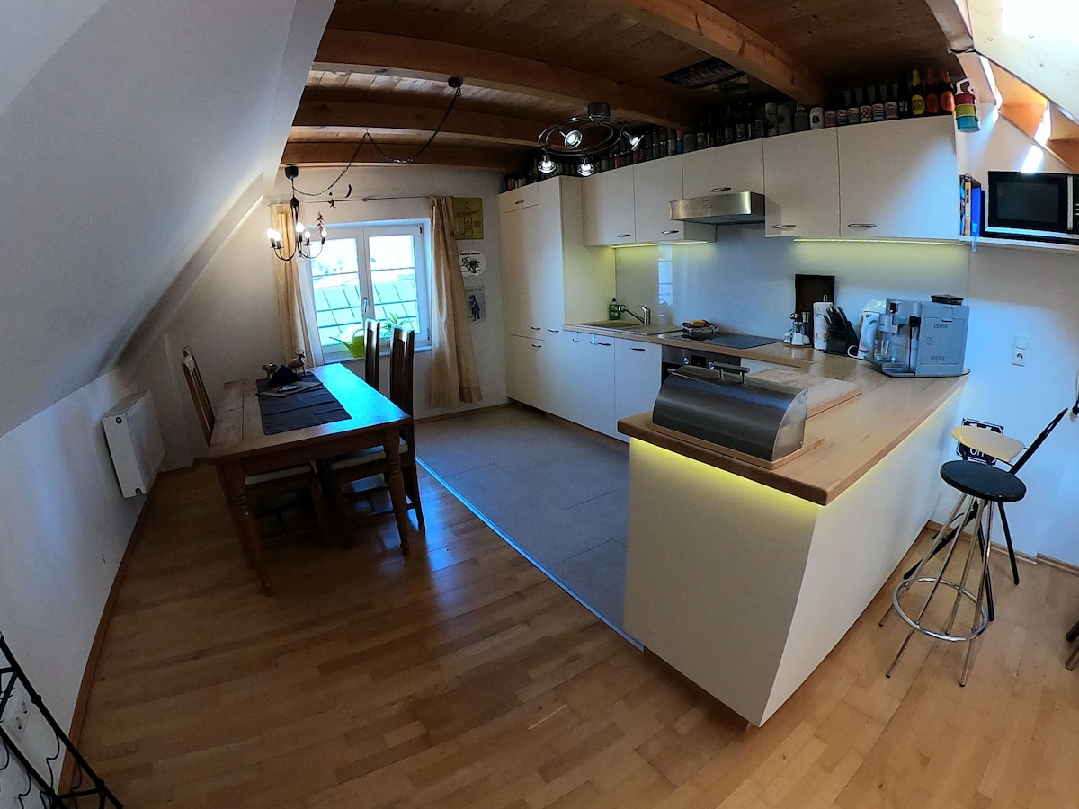 Stylish restored old barn in a stunning secluded location, offering 120 sqm of space with panoramic views of the countryside, a 50 sqm gallery with large windows, an infrared cabin, a walk-in shower, a bathtub, a luxury designer kitchen, terrazzo marble flooring with electric underfloor heating, a historic tiled stove from 1700 and a fenced garden for as many dogs as you like. A dream just 15 min. from Passau, 3 min. from the motorway, and 10 min. from the Danube. Bookable from Nov 2025